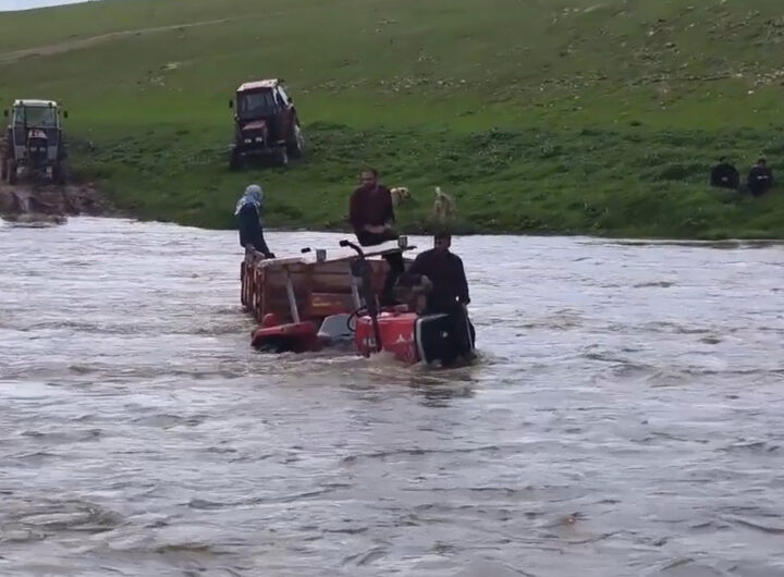 Şanlıurfa’nın Ceylanpınar ilçesinde etkili olan sağanak yağış sonrasında debisi artan bir dere, üç kişinin traktörle geçiş yaparken...