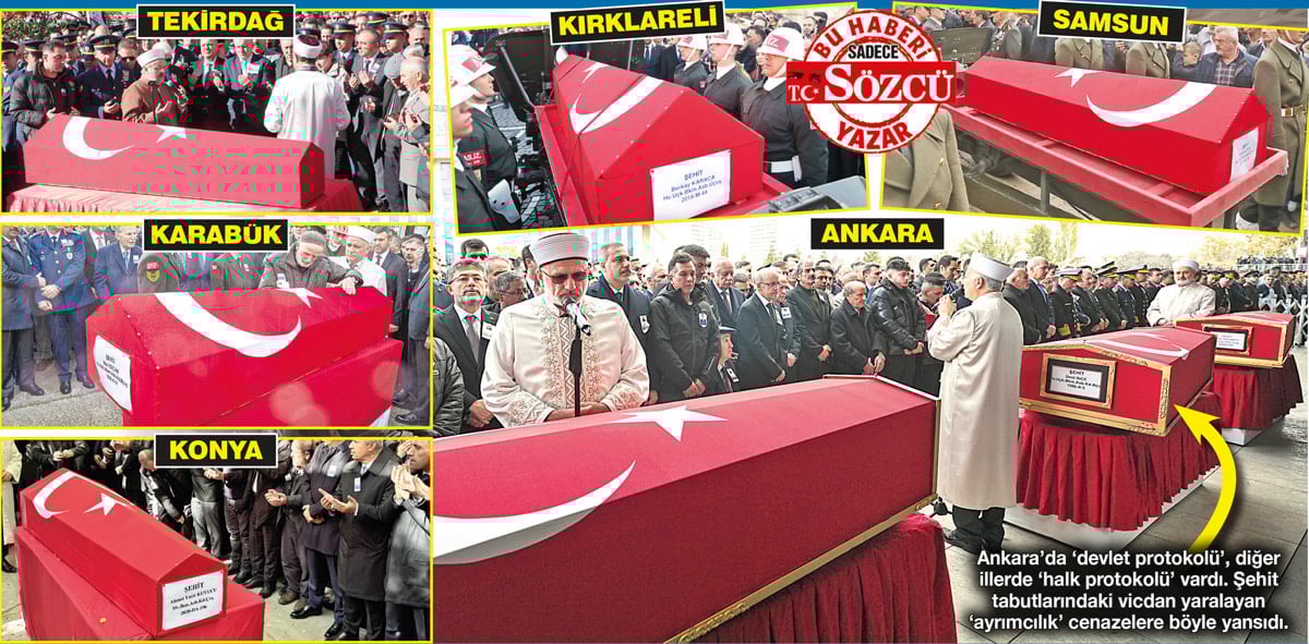 Ancak Türkiye’de neredeyse her alanda karşımıza çıkan ayrımcılık milli acımızda da yaşandı. Ankara’daki devlet erkanının katıldığı törene üç şehidin cenazesi altın varağa benzetilen sarı şeritlerin olduğu tabutla getirildi. Tabutta kahramanların adının yazıldığı levhaların etrafı da altın rengi çerçeveyle kaplıydı. Şehitlerimiz, diğer illerde ise her zamanki gibi bayrağa sarılı normal tabutla uğurlandı. İsimleri ise beyaz bir kağıda yazılmıştı.
