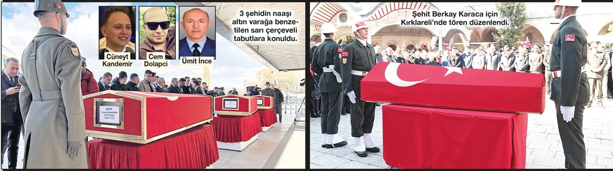 Şehitlerin tabutlarının birbirinden farklı olması kafalarda soru işareti yarattı. Vatandaşlar, “Her biri bu vatan uğruna şehit düştü. Neden bu ayrımcılık?” dedi.   Ankara Hamdi Akseki Camii’nde Cüneyt Kandemir, Ümit İnce ve Cem Dolapci için düzenlenen törene şehitlerin ailesi ile Cumhurbaşkanı Yardımcısı Cevdet Yılmaz, TBMM Başkanı Numan Kurtulmuş, bakanlar, Yaşar Güler, Hakan Fidan, Mehmet Şimşek ve İbrahim Yumaklı ile MHP lideri Devlet Bahçeli, İYİ Parti lideri Müsavat Dervişoğlu, Genelkurmay Başkanı Selçuk Bayraktaroğlu, kuvvet komutanları, milletvekilleri katıldı. Devlet erkanı şehit ailelerine taziyelerini iletti.