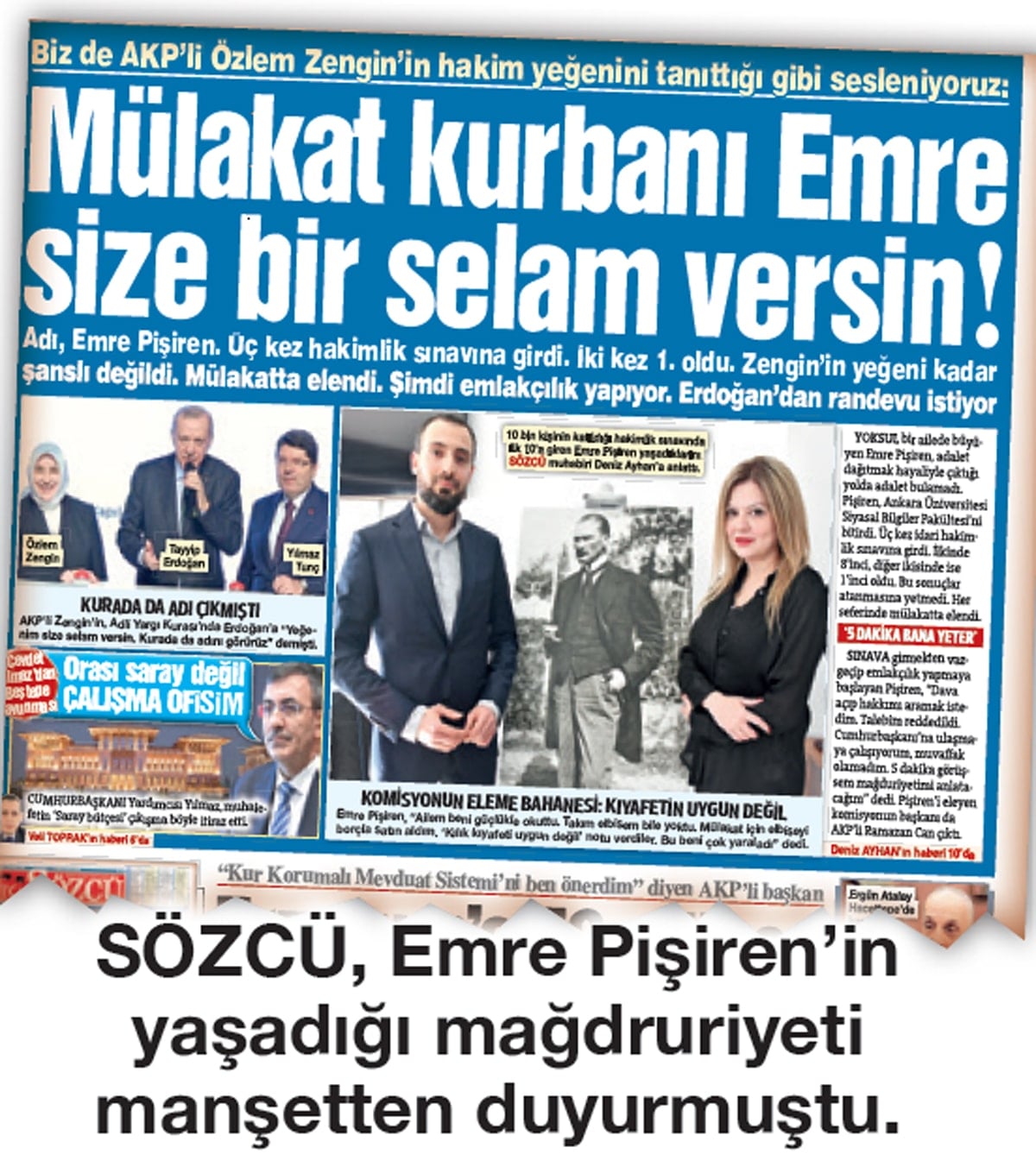 Dramını SÖZCÜ gündeme getirdi “Mülakat kurbanı Emre size selam versin” manşetiyle yankı yarattı. AKP Grup Başkanvekili Özlem Zengin, SÖZCÜ’nün haberinin ardından harekete geçerek, Emre’ye ulaştı ve “Emre’cim… Gazete manşetleri üzerinden ilettiğin görüşme talebin üzerine ben de buradan, kamuya açık bir şekilde, seni önümüzdeki hafta, TBMM’ye davet ediyorum” dedi. Pişiren de davete katılacağını söyledi. Zengin, “Hafta için Emre’yi Meclis’e davet ettim. Ben mülakata karşı olduğumu her fırsatta dile getiriyorum. Geçen hafta Milli Eğitim bütçe görüşmelerinde de bunu belirttim’’ dedi.